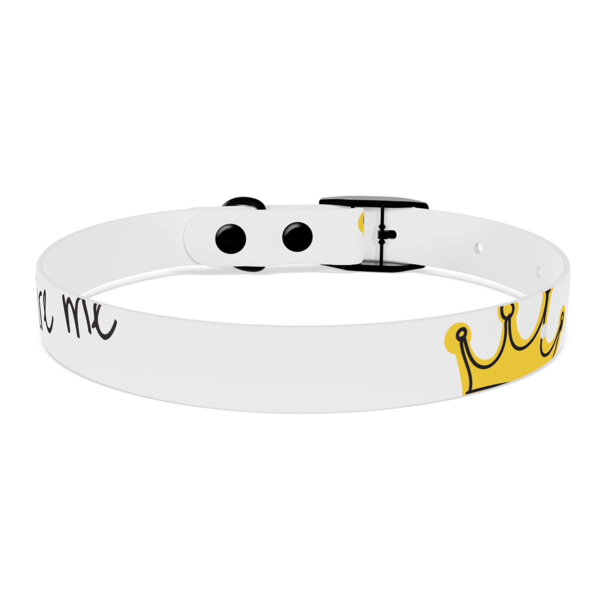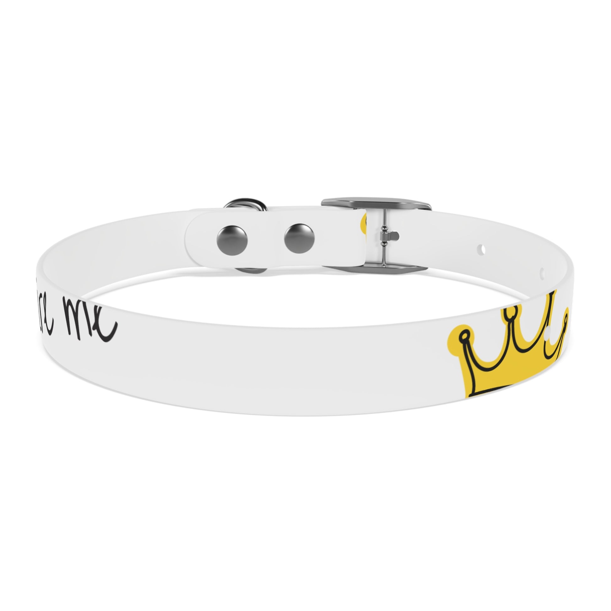 A lightweight, waterproof collar that brings playful style to everyday walks and messy adventures. The slim white band features hand-lettered script and a small golden crown accent — a quiet nod to personality without shouting. Built from flexible, odor-resistant TPU, it stays comfortable on active dogs, resists stains and smells, and wipes clean after puddles or beach days. Choose from four anodized aluminum buckle finishes to match your dog’s vibe and four sizes to get a snug, secure fit. This collar suits pet parents who want durable, hypoallergenic gear with a simple, artistic look that ages gracefully with outdoor life.